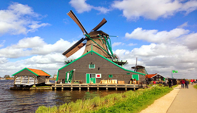 想去荷兰看风车吗?最理想的去处之一就是桑斯安斯。桑斯安斯(Zaanse Schans)是荷兰西北的北荷兰省的一个小村,有"荷兰风车博物馆"之称,收罗保存完好的荷兰古式风车和房屋,是荷兰一个著名的旅游景点。桑斯安斯一般人会直接简单叫风车村。桑斯安斯对于很多游客来讲就是一个开放式的博物馆。这里可以看到荷兰人如何利用风车产生动力,研磨制造材料的木材。进入这个区域并不收门票,不过有些开放参观的风车的博物馆是酌情收入场费。这里还有各式各样的小博物馆,例如乳酪工厂、类似手工艺品、木鞋工厂等,相当有趣。